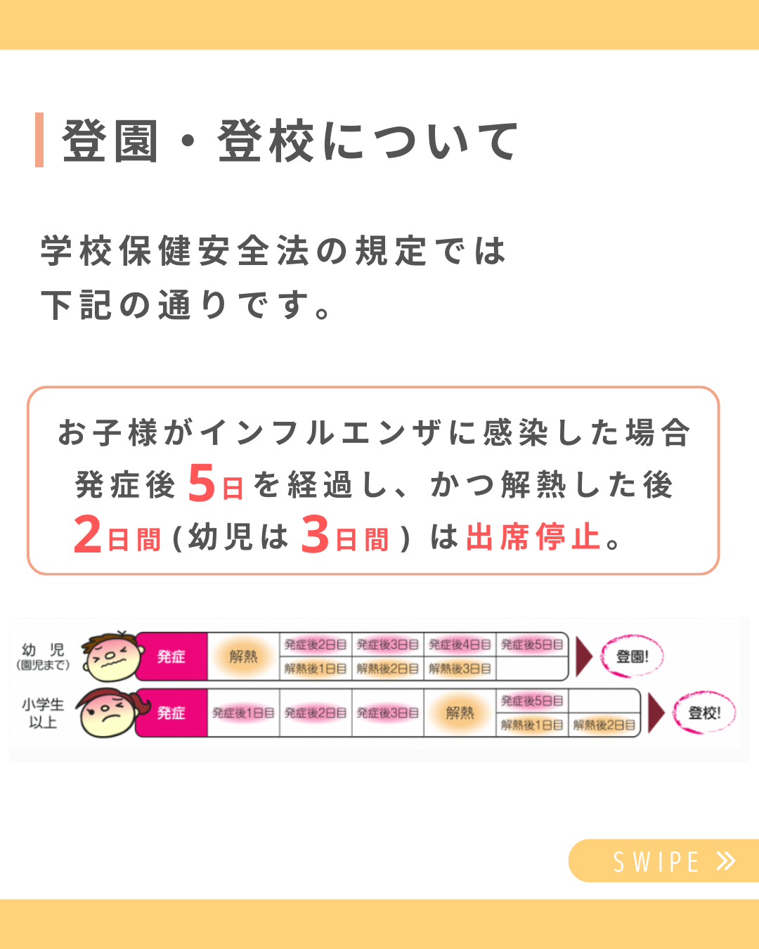 発症後5日を経過し、かつ解熱した後2日間(幼児は3日間)は出席停止。