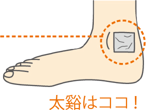足の内くるぶしとアキレス腱の間のくぼんでいるところにある ※一日じゅう貼っていてもいい。 日中に貼るとじゃまになる場合は、就寝時だけでもかまわない