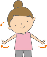 ❶両足を肩幅程度に開いて立つ。両腕を45度の角度で広げ、両手首を可能な限り上に反らせる