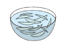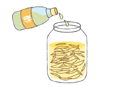 - しょうゆとみりんと酢を大さじ6ずつ、好みで細切りにしたコンブを保存容器に入れる。